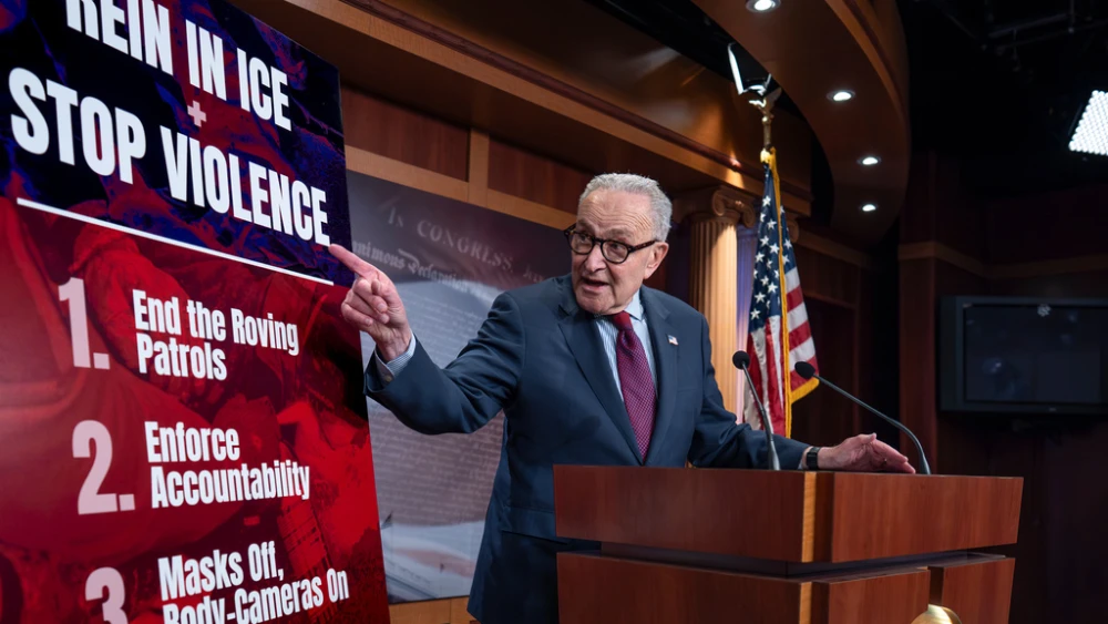 Senate Minority Leader Chuck Schumer, D-N.Y., speaks to reporters at the Capitol in Washington, Thursday, Feb. 12, 2026. (AP Photo/J. Scott Applewhite)