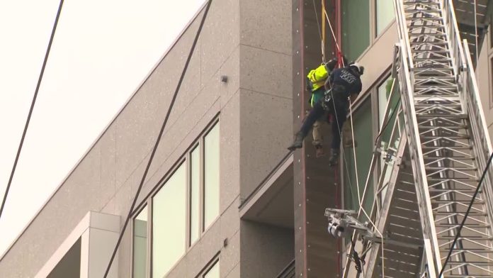 • Sacramento Fire Department crews responded to the mass-timber building on 15th and Q streets around 9:14 a.m. and executed a rope rescue from above the workers.